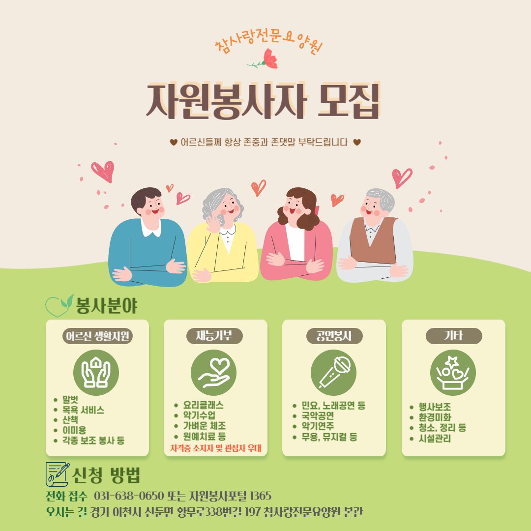 - 어르신생활지원 : 말벗, 목욕서비스, 산책, 이미용, 각종 보조 봉사 등